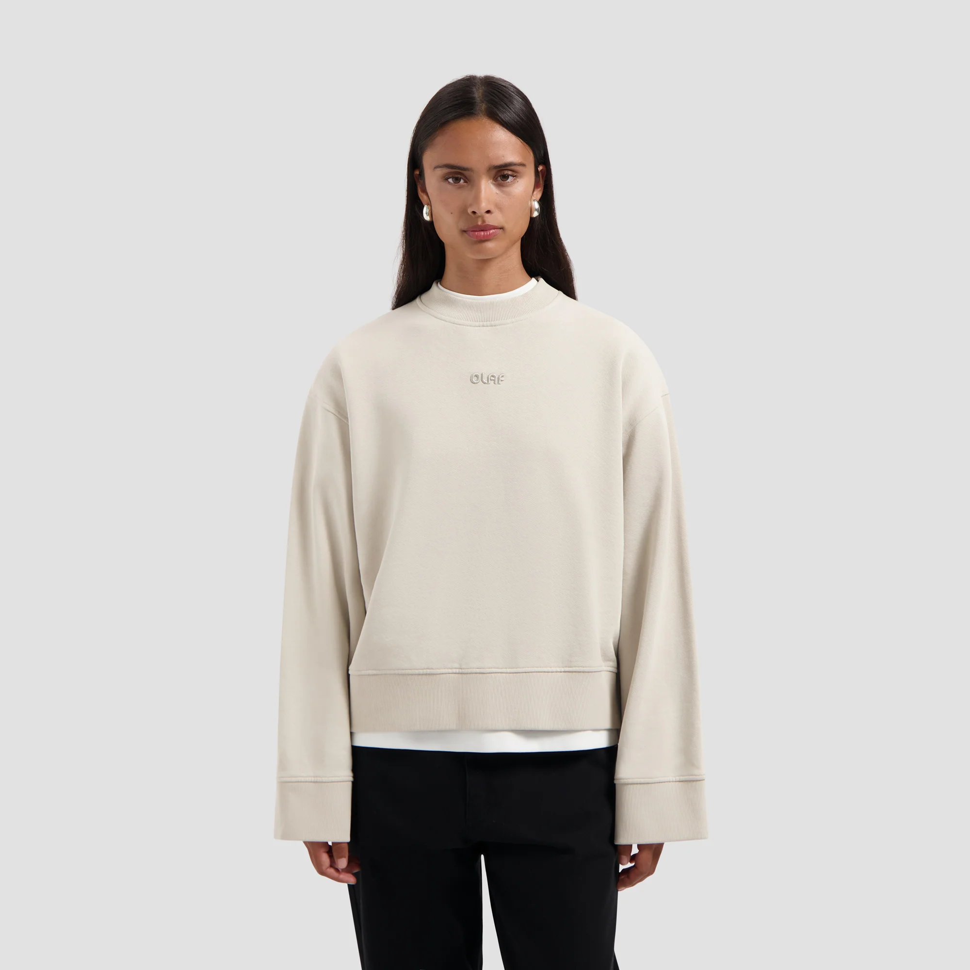The Retro Logo Crewneck in Cement brings flared sleeves and a comfortable fit. It's made from 100% organic portuguese cotton and features a retro logo embroidery at the front. It is perfect for adding subtle style and a hint of nostalgia to any outfit, whether layered or worn on its own.